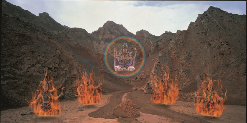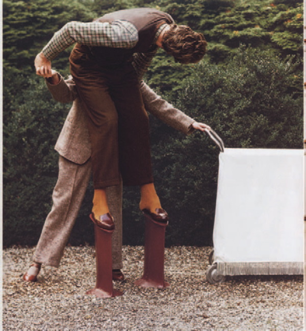 Фотографии и фильмы голландской художницы Лизы Мэй Пост (род. 1965) наполнены магией сновидений. Она часто использует специально сшитые костюмы, а также приспособления, с помощью которых тела приподнимаются в воздух и принимают странные формы. В работе «Тень» [50] на персонажах – андрогинные костюмы, скрывающие пол и возраст. Персонаж первого плана стоит на ходулях, тело его находится в неустойчивой позе. Вторая фигура более устойчива, но при этом касается искусственной клешней странного устройства на колесиках, накрытого покрывалом с бахромой, что придает всей сцене ощущение хрупкости. В деталях фотография гиперреалистична, и, как это бывает в сюрреалистическом сне, благодаря внешнему виду и сочетанию этих деталей зритель получает большую свободу в интерпретации нарратива. Замечательным типом использования «живых фотокартин» служит формат, включающий в себя напряженный, но неоднозначный сюжет, который порождает у каждого зрителя собственный ход мысли.