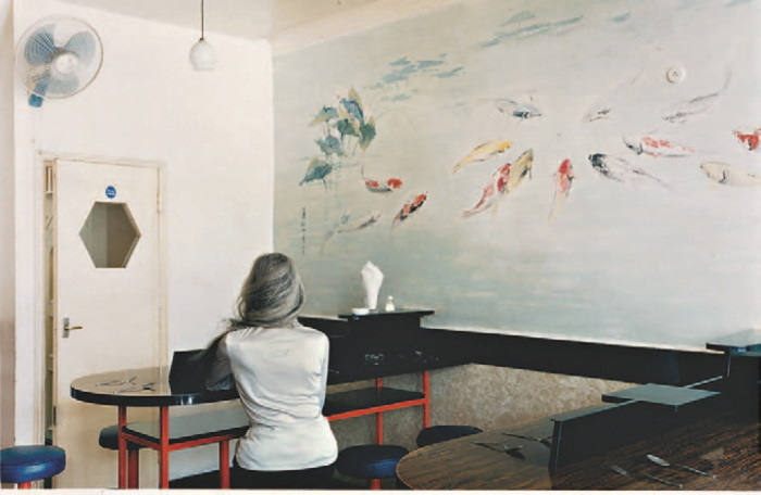 В работе Ханны Старки (род. 1971) «Март 2002» [53] женщине, сидящей в японском ресторане, с помощью того же приема придан сюрреалистически-загадочный вид. В этой женщине можно увидеть и искушенную горожанку, которая пришла на тайное свидание, и некое сказочное существо с клубящимися у плеч длинными седыми волосами – она чем-то напоминает русалку из сцены, изображенной на стене ресторана. Возникает ощущение, что постановочные фотографии Старки основаны на ее наблюдениях: она привносит в реальные ситуации налет воображаемого, воспроизводя их в приукрашенном виде в форме сложных фотодрам с элементом фантастического. И у Кирни, и у Старки повернувшиеся к нам спиной фигуры не дают достаточной информации для того, чтобы как-то охарактеризовать центральный элемент кадра. Вместо этого смысл мы извлекаем из динамического процесса установления связей между внутренним пространством, предметами и вероятными свойствами изображенных людей. Окружающая фигуры обстановка – отнюдь не только подтверждение их идентичности, это единственный ключ к тому, кем они могут являться.
