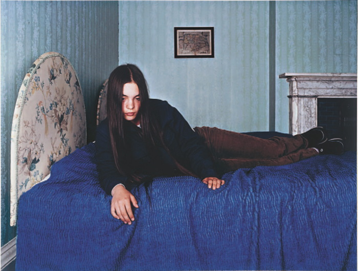 В последнее время английская художница Сара Джонс стала делать интерьерные портреты девушек, в которых намеренно обыгрывается несоответствие между подлинным и навязанным, как в смысле образности, так и в смысле опыта. В работе «Гостевая комната (кровать) I» [55] изображена девушка, лежащая на кровати в тусклой, обезличенной комнате. Поскольку мы знаем, что это не ее собственная комната, кровать превращается в особый мотив, символизм которого почерпнут из истории искусств (на ум приходит «Олимпия» Мане), а горизонт, который создает пространство кровати, вызывает ассоциации с композицией пейзажей с изображением воды и суши. У девушки длинные, совершенно естественного вида волосы, однако в силу того, что они не отсылают ни к какой современной моде, образ обретает многозначность, сочетая в себе архетип и конкретную личность. Кроме того, поза девушки до определенной степени служит непосредственным откликом на ситуацию, которую Джонс создала для того, чтобы снять этот кадр, но одновременно возникает ощущение, что она почерпнута из арсенала дофотографического языка тела, из множества лежащих женских фигур, известных в живописи и в скульптуре.