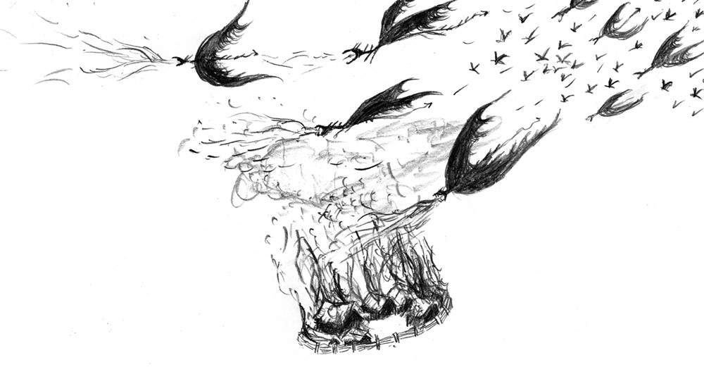И вместе с очередным воплем он выплюнул язык ярко-голубого пламени, ударивший в деревья впереди. Листья вспыхнули зелеными звездами и осыпались на землю уже черной пылью и черепками.