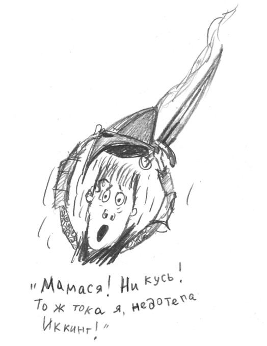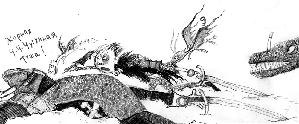 Но к величайшему несчастью, он, забывшись, проорал это все на языке, на котором разговаривал весь последний год (понимаете, с людьми общение как-то не складывалось). Не на Северном наречии, а по-драконьи: «Мамася! Ни кусь! То ж тока я, недотепа Иккинг! Да кыш от листвяки, ща те па черепоку вниз-бах!»