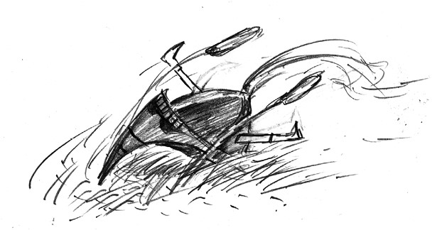 Но с перепугу он забыл дурацкий шлем с перьями в камышах.