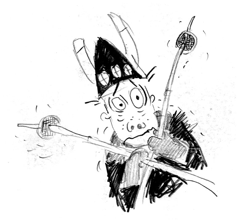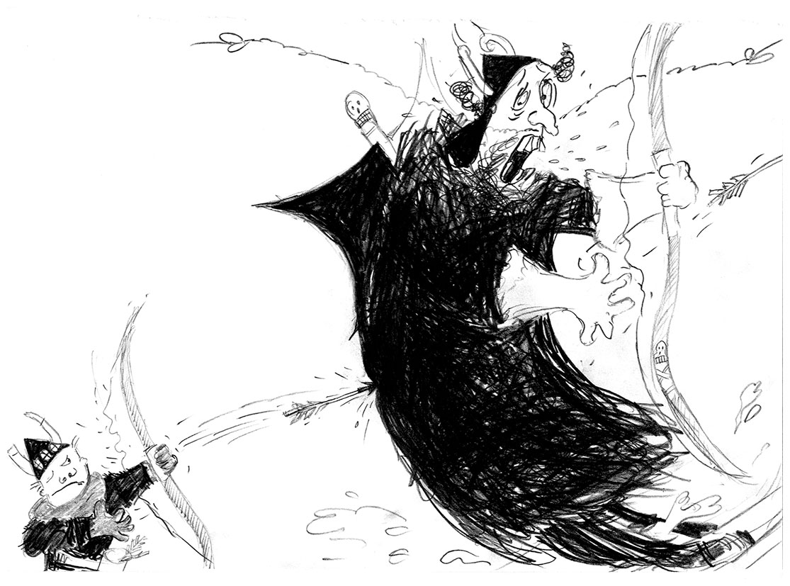 Громила-с-Топором испустил громкий рев и взмахнул руками. От неожиданности он выпустил тетиву, стрела взмыла вверх, описала красивую дугу – и (по чистейшей случайности) вонзилась в зад Истероиду, ехавшему впереди Громилы.