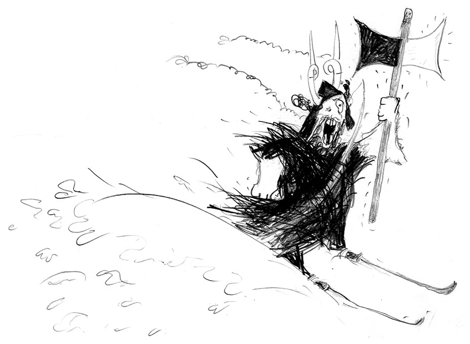 А далеко вверху, над обрывом, Громила-с-Топором от злости переломил лыжные палки, как спички. К небесам вознесся его громоподобный голос: