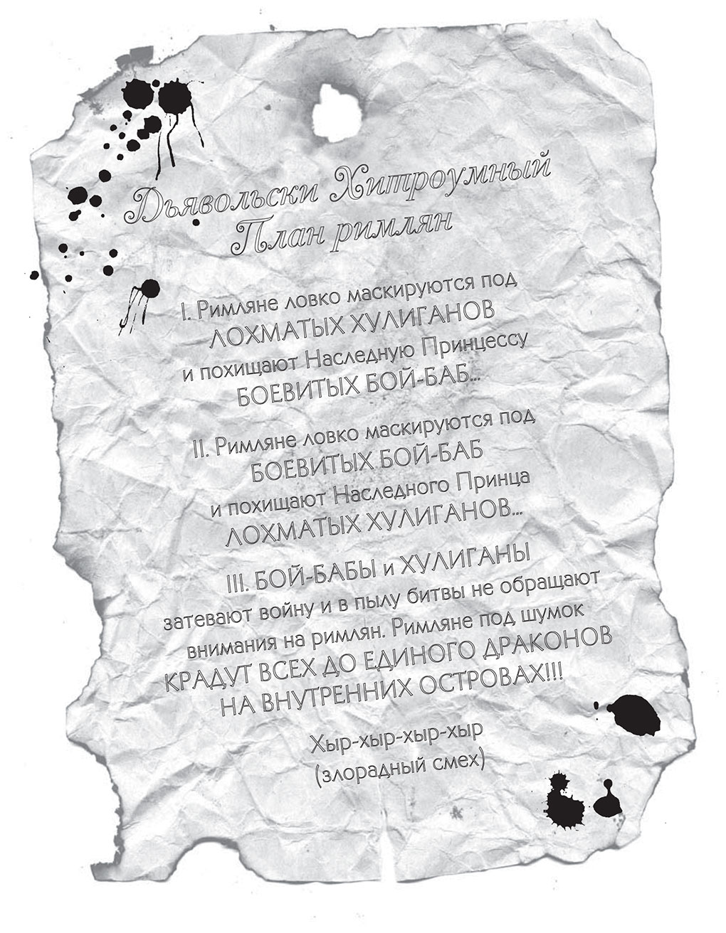 Иккинг быстро прикинул расклад сил. С одной стороны: триста пятьдесят лучших солдат Римской империи, вооруженных дротиками, мечами, копьями, стрелами, саперными лопатками и т. д. и т. п. С другой стороны: два жалких викинга с двумя маленькими драконами, один из которых впал в кому, а другой объявил забастовку.