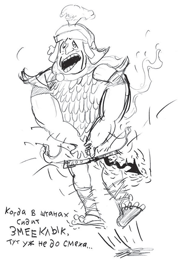 Когда у вас в штанах сидит змееклык, тут уж не до смеха. Центурион скакал по палубе, скорчившись пополам и визжа, как поросенок, но никак не мог вытащить из подштанников кусачего, колючего, царапучего змееклыка.