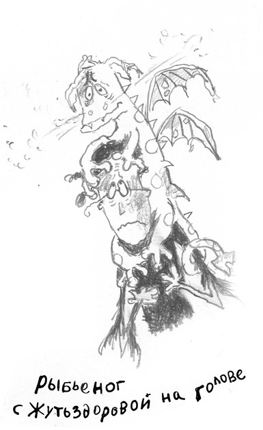 Рыбьеног потерял шлем, а его дракониха Жутьздорова так перепугалась, услышав песнь Мятежных драконов на отвесной скале, что уселась Рыбьеногу на макушку и для надежности запуталась когтями в волосах. Всю дорогу она непрестанно мычала от страха. (Детеныши драконов, почуяв опасность, часто забираются матерям на голову или спину.)