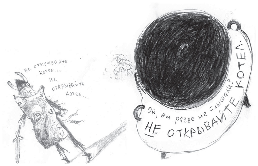 Крышка оказалась такая тяжелая, что троим вождям пришлось поднату-у-ужиться, чтобы столкнуть ее с котла. И вот она с оглушительным лязгом и звоном упала на пол…