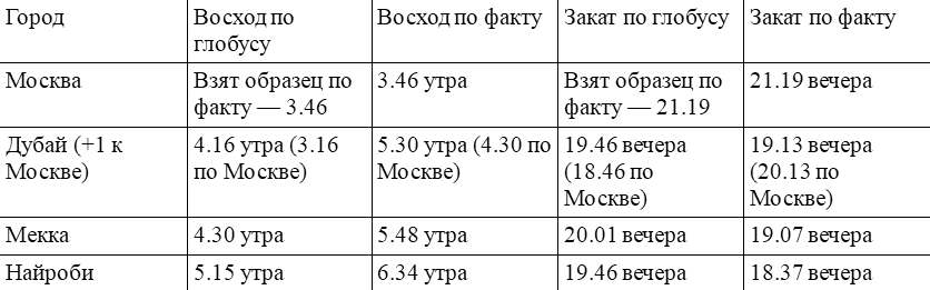 Нарисовав таблицу, внимательно в нее всматривалась. Закат Найроби и в Дубае на глобусе происходит одновременно… В 19.46. А по факту закат в Найроби раньше на почти 50 минут… Закат же в Мекке по глобусу позже, чем в Найроби, а по факту – раньше… Настоящая путаница!
