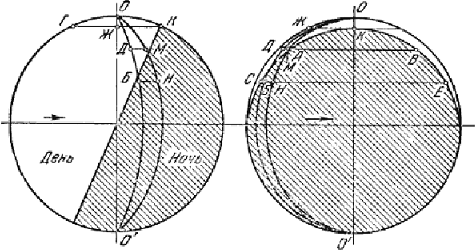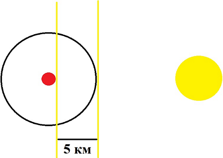 – Ну вот! А теперь смотрим, что видит человек на закате или восходе, – достав из рюкзака небольшой блокнот и несколько цветных карандашей, стал рисовать. – Так. Красный круг это наблюдатель, – обозначил первое. – Черный круг вокруг него это радиус его наблюдения в 5 км. По теории шарообразной Земли лучи захотят, образуя прямую линию с северного полярного круга, до южного. Находясь на точке, например, Москвы и глядя в сторону солнца, ты увидишь удивительное. Разделение на день/ночь неба. Никакого уменьшения углового размера осветленного участка солнца вообще не должно быть. Только строгое деление неба на две половины по 180 градусов. Это еще что! То самое затемнение области неба должно наблюдаться совсем короткое время.