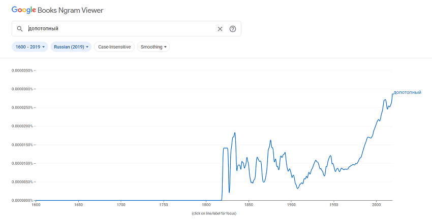 Можно конечно подумать, что книг было так мало, что основной их массив появился именно после этих дат. Но если взять простые обиходные слова: дом, любовь, семья, еда, деньги… То они употребляются в книгах с 1500 годов. И не так, чтобы редко. Даже слово «республика» употребляются с 1500-х. А вот то, что связано с завалами, допотопным – только после 1800-х.