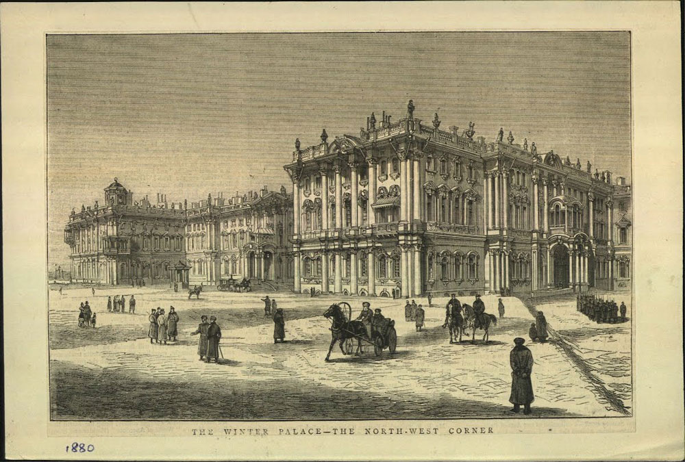 На гравюре Зимний дворец в 1880 году. Он выглядит абсолютно так же, как и на современных фото. Кстати, хорошо заметно, что уже тогда окна посажены в землю и высота первого этажа сильно разнится со вторым.