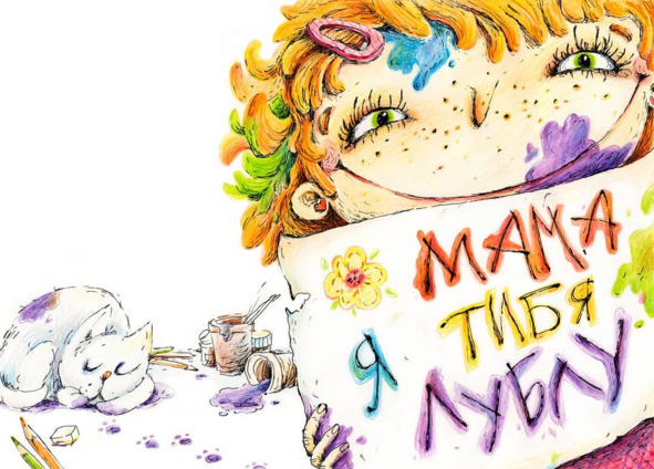Что же маме подарить?Чем же маму удивить?Нарисую краской ейЯ открытку поскорей!Целый час я рисовала,Буквы кисточкой писала!Клякса синяя на лбу…«Мама, я тибя лублу!»