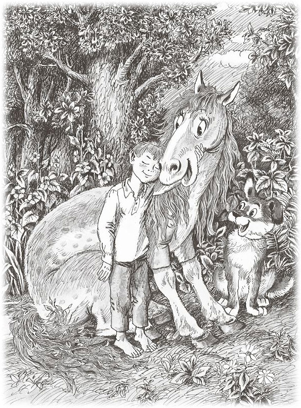 Глаза у неё были как крыжовник, грива – как хмель, который оплетает заборы и деревья, спина была как мягкий мох, и её всегда хотелось погладить. Чулочки на ногах – серебристые, как листья тополя, а уж хвост был похож, извините, на можжевельник. Жила Зелёная Лошадь на воле, в лесах и в глуши, и паслась где хотела. Заприметить её среди зелени было очень и очень трудно, и люди, которые ходили в лес, никогда её не замечали.