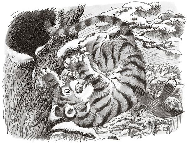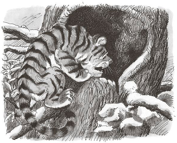 Залез тигрёнок в дупло и только хотел в клубочек свернуться, как медведица вздохнула, а после так выдохнула, что он вылетел из дупла. Летел он, летел по воздуху, а потом в снег упал. Но не сильно упал, не разбился, а только в снег зарылся. И пока он летел, он всё время думал: «Хорошо бы где-нибудь в клубочек свернуться, чтоб согреться».