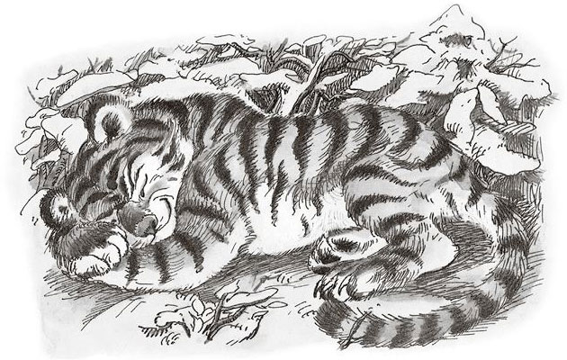 Окружил его тигрёнок своими мягкими лапами, положил на лапы голову, да и заснул под вой метели.