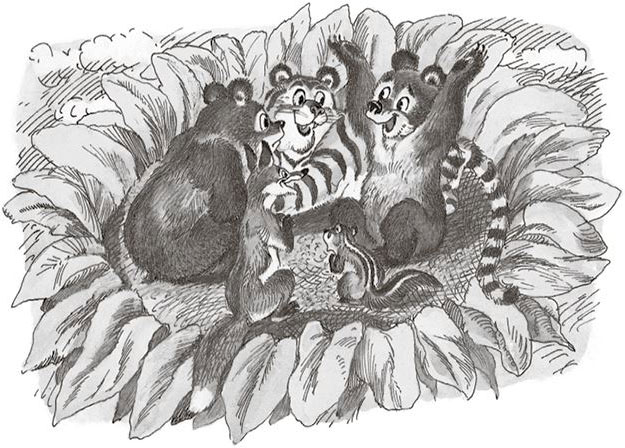 Скоро пришла весна. Проснулись бурундук и медвежата. Забрались на подсолнух, а там – тигрёнок спит. Разбудили его.