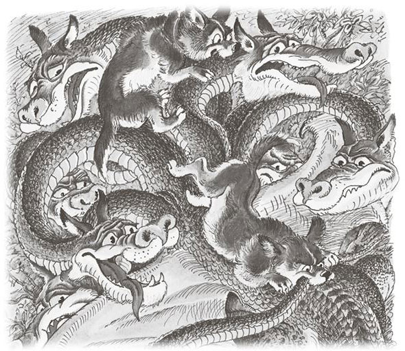 Разъярился Горыныч и хотел уж расправиться с нахалом, но тут к нему подскочили собаки. Одна вцепилась ему в хвост, другая – в гриву. Пока Горыныч соображал, что к чему, – младший брат отрубил ему все девять голов, приговаривая: «Чик-чик-чик!»