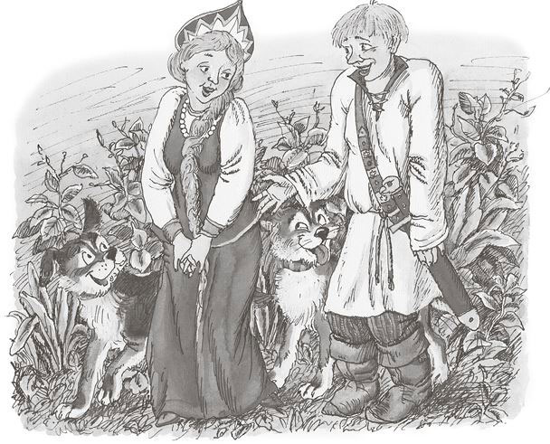 Смутилась страшная жена Горыныча: её никогда не называли красавицей. Тут подскочили к ней собаки, вцепились в рукава и потянули в разные стороны. Потянули собаки за рукава в разные стороны, и вдруг – трах-бах – из одной жены Горыныча получились две молодые девушки. Да такие на вид милые и скромные, что просто удивительно! Старший брат сразу обомлел. Тогда одна девушка подошла к камням и дотронулась до них веточкой черёмухи. Зашевелились камни на морском берегу, посыпались с них песок да пыль – и встали два брата и их собаки, живые и невредимые. Тут кинулись братья целоваться да обниматься, а потом пошли все в королевский город.