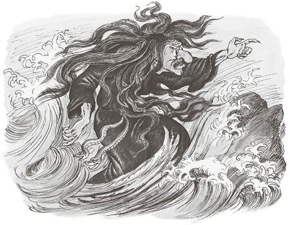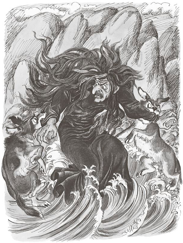 Только подошёл он к морю – вдруг бежит на берег тяжёлая волна. Рассыпалась волна по песку, и вышла из неё страшная баба. Лицо зелёное, косы сплетены из коричневых водорослей. Это была жена Горыныча.
