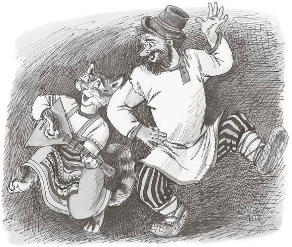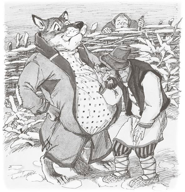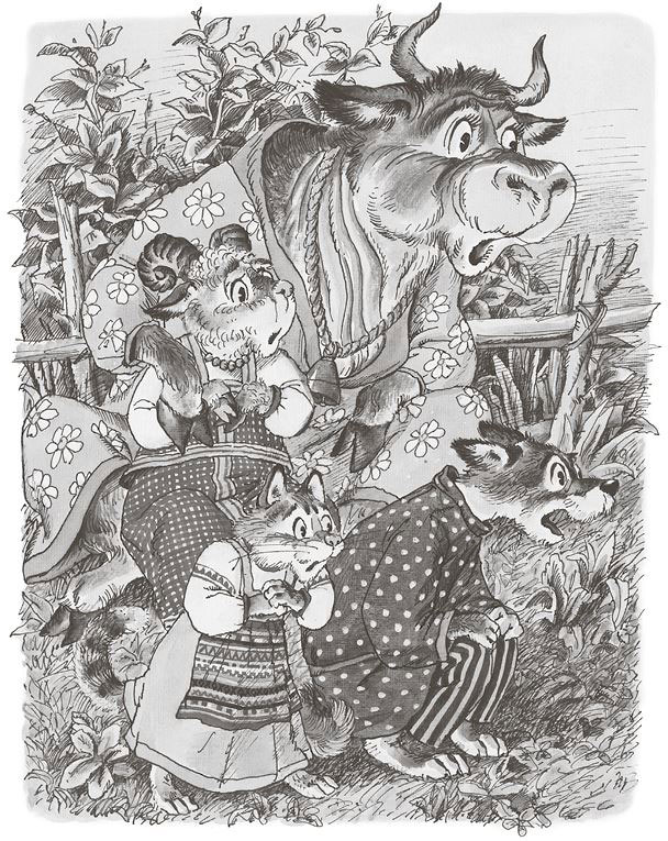 Ударили они по рукам и стали переворот делать. Скачут по волчьему брюху – старик кричит, а кошка мяучит. Скоро к ним и другие проглоченные прибежали: и собачка-пустолаечка, и Басуля-коровушка, и овечка-тихоня нашлась где-то в животных закоулках.