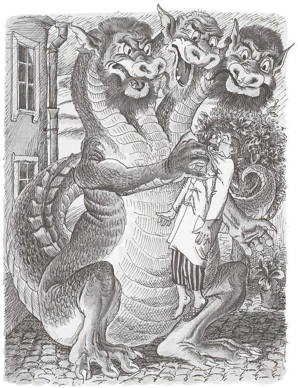 И тут он всунул в парикмахерскую когтистую лапу, схватил парикмахера за грудки и вытащил на улицу. И Кремдлярук увидел, что он в лапах огромного двухэтажного дракона, у которого три головы – рыжая, лысая и усатая!