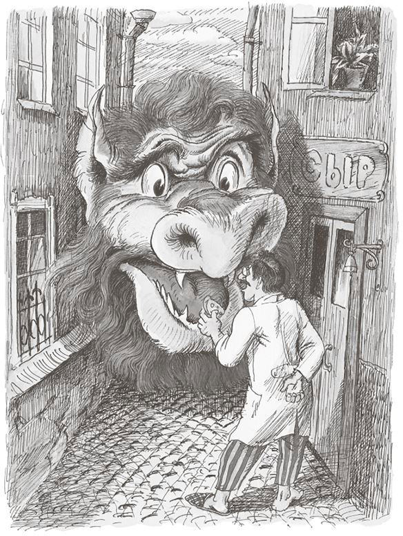 А потом вот что произошло. Дракон тоже завернул за угол и увидел, что перед ним три переулка. Очень узеньких. И тут Лысая голова побежала прямо, Усатая повернула направо, а Рыжая – налево. А переулки были такими узкими, что в них приходилось протискиваться. И вот все три головы протиснулись в разные переулки, а тело-то осталось позади. Вот такая получилась история! Застрял Дракон. Дёргает своими головами, а ничего не выходит. Вперёд головы лезут, а назад – ни в какую. Уши мешают!