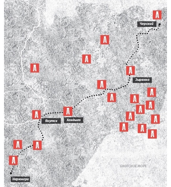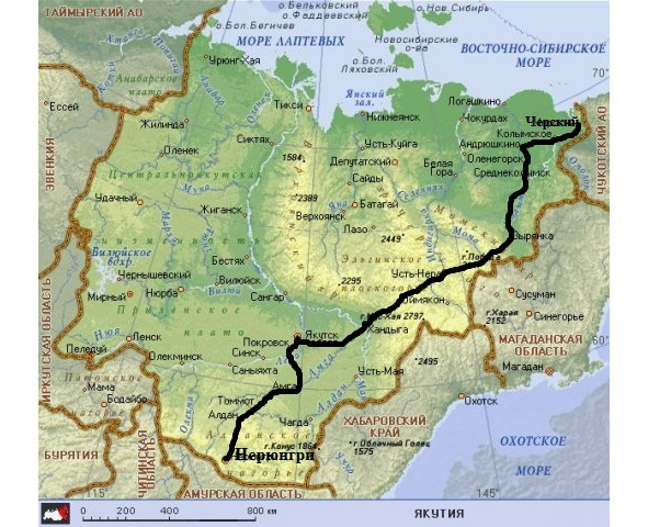 Нерюнгри – Алдан – Якутск – Хандыга – Усть-Нера – Бурустах – Сасыр – Угольное – Зырянка – Среднеколымск – Аргахтах – Андрюшкино – Колымское – Черский.