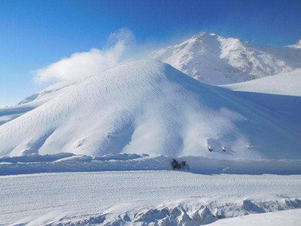 Ветер с обеда стал крепчать и встречал меня своими порывами. Со всех сторон Горы. Вчера они казались «мягкими» и климат функционировал умеренно. Сегодня очень остро шумит ветер, река осталась далеко внизу. Мне следует есть намного больше, в таких нагрузках и климате, иначе сейчас, чаще находит усталость, замерзание и «отупление» холодового характера. Нужно много сложных калорий. А не хлеб с кипятком, что у меня на перекусе. Радует, что в крайние дни перед выездом организм потерял и теряет кг веса. Значит организм будет работать интенсивнее и качественнее. Табличку перевала «Талдык» более 3600 метров по высоте, не фотографировал, иначе это стоило бы может жизни. На перевальной точке меня встречает ветровая стена из снега, видимость ноль, на секунды мне стоило призадуматься, но сделав усилие рванул велосипед и через переметы дороги, с обледеневающим лицом, пробился через ветровую стену ниже уровня перевала. Горы очень красивые. Запредельная красота. Стихия в своем величии. Ставлю под ракурсы велосипед и делаю фотографии. Достать штатиф и зеркалку – это не про меня)). Уж слишком много на это сил и времени. Может дальше.