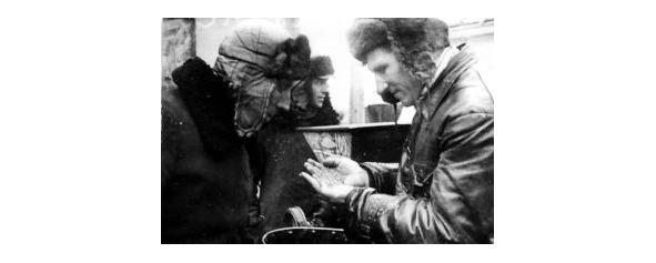 Председатель колхоза Донской скакун Хромушин Иван Ефимович (справа) и завхоз Титов проверяют качество посевного зерна. Фото 1937 года.