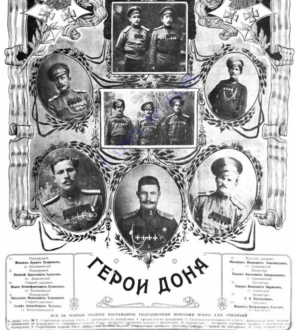 5850. СВЕТЛИЧНЫЙ Федор (Казак ст. Кахановской, ТКВ) – 2 Кизляро-Гребенский каз. полк, 2 сотня, ст. урядник. Награжден Георгиевским крестом 1 ст. №5850, 5.08.1915 от Имени Государя Императора, Его Императорским Высочеством Великим Князем Георгием Михайловичем по случаю годовщины войны. Награждён ГК 1 ст. №3942 вместо креста 3 ст. N 44786. Награждён ГК 2 ст. №21055: «За то, что в бою 30.04.1915 у с. Жукоцин, под ружейным и артиллерийским огнем противника, личным мужеством и храбростью, при атаке увлекал товарищей вперед, чем способствовал общему успеху». Награждён ГК 3 ст. №6961 Верховным Главнокомандующим за оказанные им подвиги храбрости и мужества в боях с австрийцами в Буковине. Награждён ГК 3 ст. №44786*: «За то, что в бою 16.12.1914 у д. Петроуц, находясь в составе взвода, атаковавшего противника, первым бросился на пехотную заставу, засевшую в окопе и примером отличной храбрости увлекал за собой остальных людей взвода, чем и способствовал взятию в плен всей заставы». Заменен на крест 1 ст. No 3942. Награждён ГК 4 ст. №26721: «За подвиги мужества и храбрости в бою 27-го и 28.08.1914 у д. д. Прзепозль и Незавиза». Имеет Георгиевские кресты [I-3942, II-21055, III-6961, IV-26721] *