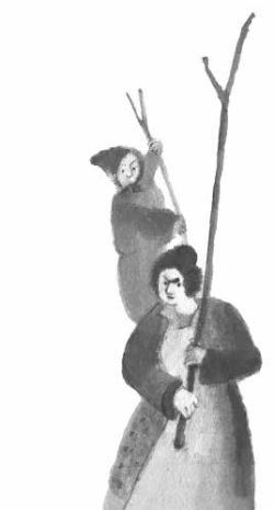 Но у дома Василий совсем растерялся: дяденька исчез, а вместо него на садовой дорожке стояли тётя Клава и тётя Глаша. Каждая крепко держала в руках подозрительно острую рогатину… Выглядели тётеньки решительно и опасно.