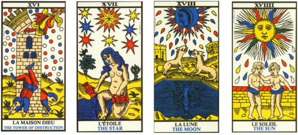 Изображения на картах с 17 по 19 – Звезда, Луна, Солнце – рождают ассоциацию с «фонтаном Меркурия» – структурой «Верхнего Мира» (см. /2/ и рис. 12).