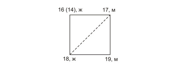 Далее будем придерживаться гипотезы об ошибке в нумерации, поставив на место первой карты Жреца. Тем более что рядом со Жрицей, имея номер 1, он выглядит более уместно. Это будет единственное изменение в нумерации карт, и оно принесет свои плоды. Расположим эту группу в виде квадрата, как изображено на Рис. 2.
