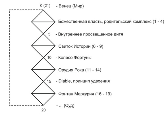Плоскость симметрии этой структуры – исторический кватернион – является одновременно и «полем битвы за власть над человеком». Так, к примеру, принцип удвоения (карта 15) через создание в личной истории ситуации подвешенности (карта 12) является источником существования необходимости выбора в юности (карта 6). Противостоит в этой ситуации карте 12 со стороны родительского комплекса карта 3 – Царица, небесная мать (см. связи на рис 10). Отметим при этом, что числовое значение карты «подвешенный» также является удвоением номера карты «выбора» (которая в свою очередь является удвоением номера карты матери из родительского комплекса). Сама ситуация выбора, при «ошибочности» последнего, может привести к ощущению своей подвешенности в контекстно-смысловом пространстве. Чисто эмоционально это часто воспринимается, как опрокидывание мира – ты более не стоишь твердо на земле, и берегущие руки судьбы оборачиваются удавкой рока. Интересно отметить, что рисунок 12 карты не только дает наглядный образ этой трансформации положения человека, но, возможно, и дает толчок к возникновению образа положения сознания относительно границы с бессознательным. Поскольку обычно человек ассоциировался с крестом, перекрестье которого находится выше середины, то крест перевернутого вниз головой человека имеет перекрестье, находящееся ниже этой границы. Эта ситуация, с одной стороны, приводит к постоянству давления, вытесненных в бессознательное, содержаний на границу сознательное-бессознательное и прорыву их в сферу осознания, а с другой – могла интерпретироваться в рамках рассуждений о последствиях положения перекрестья в «водах бессознательного». Последнее предположение допустимо, если будут обнаружены какие-нибудь основания связать исходное построение карт Таро с гностицизмом, с его многообразными интерпретациями различных тетраграмм («четвериц»).