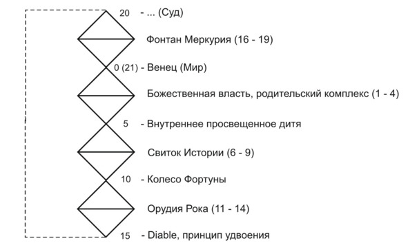 На ней 15 карта противоположна нулевой. И, если символом нулевой карты служит круг – символ цельности, то Диавол20, представляющий 15 карту, – символ удвоения21, в том числе и в смысле разделения полов. Эта карта упоминается К. Г. Юнгом на семинаре по активному воображению (1 марта 1933 года): «В Таро есть изображение гермафродита на карте Дьявол (diable). В алхимии это золото. Другими словами, такая попытка объединить противоположности для христианского мышления является дьявольской, каким-то злом, недопустимым, чем-то, что относится к области чёрной магии» /5, с. 923/.