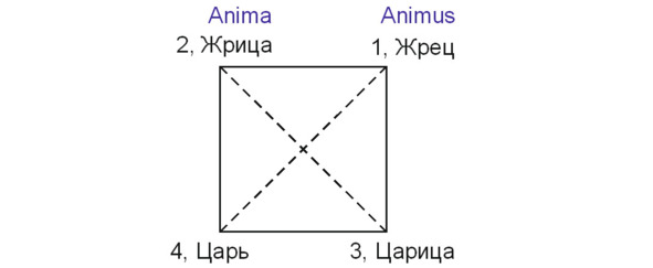 Нумерация слева направо была принята в еврейских и арабских эзотерических построениях, и мы используем ее для первой группы. Карты 3 и 4 образуют «царскую» пару, а весь квадрат – брачный кватернион, хорошо известный в аналитической психологии К. Г. Юнга.10 При этом карта 1 символизирует Animus королевы, а карта 2 – Anima короля. По сути, это первый кватернион, который рассматривает Юнг в своей теории человеческой самости.11 Anima, как женское начало, существует в каждом мужчине, а animus, как мужское, – в женщине. При образовании брачной пары эти две структуры взаимодействуют между собой. Царь вступает отношения с Царицей через свою Аниму (душу), а Царица, в свою очередь, – через свой Анимус (ум, дух). Эти, частично опосредованные, отношения на рисунке изображены пунктирными диагоналями. В царской паре anima и animus приобретают частичную персонификацию в волшебных образах Жреца и Жрицы. Одновременно с этим 1 – небесная мудрость, а 2 – земная душевность, т.е. первичные символы мужского и женского начала в природе. Представление первых четырех карт в виде единого брачного царского кватерниона объясняет положение на третьей карте царицы, а не более ожидаемого царя (нечетное число, более логичное чередование – М, Ж, М, Ж. Буквы М и Ж обозначают пол.). Поскольку в брачном кватернионе каждая вершина соединяется сторонами квадрата только с противоположным полом (Царь с Царицей и Жрицей (Anima царя)), то, при выборе построения квадрата по строкам, это и могло определить положение на третьей карте именно царицы. Этот кватернион является небесной презентацией родительского комплекса, сокрытого в каждом путешествующем по жизни «Шуте».