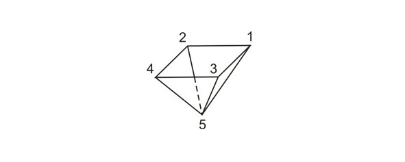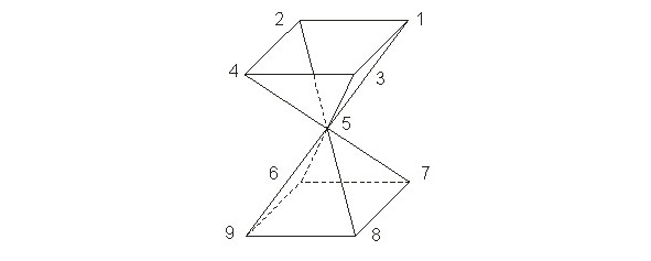 В брачном кватернионе число реальных персон равно двум, и следующая карта (с номером 5) – рождающееся от их сочетания. Кто это? С некоторой очевидностью, это не может быть Жрец. Несмотря на его мудрость, он слишком определен в своей роли для рожденного и стар. Иерофант – верховный жрец в Элевсинских мистериях Деметры, и рядом с ним всегда была Жрица-Иерофантида. Та, которая изображена на второй карте, что опять же толкает нас сблизить их в последовательности карт. Если родившийся и мудр, то как дитя, как «внутренний человек», как HOMO LUDENS (человек играющий). Ему и предстоит сыграть, выйдя на подмостки жизни. Он – внутреннее Я «Шута», его молчаливый спутник. Это поддерживает произведенную нами замену местами первой и пятой карты, Скоморох – источник Шута и одновременно его отражение в глубине души, на внутреннем зерцале. Он – квинтэссенция существования первых четырех, что отразилось в самом названии пятой карты.12 В этом варианте названия раскрывается ее смысл, как пятой эссенции [из четырех]. Поэтому, вполне логично будет изобразить ее, как выходящую за пределы плоскости первых четырех фигур, и имеющую связь со всеми ими. Назовем эту квинтэссенцию – «просвещенное дитя», подчеркивая тем, что он плод брачного царского кватерниона, и наделен внутренним знанием. В результате получается опрокинутая пирамида (рис. 3). Она представляет первую целостную структуру, содержащую свое порождение (квинтэссенцию). Отметим, что на место этой карты может претендовать не только Маг, но и ранее не идентифицированная карта из колоды Висконти-Сфорца.