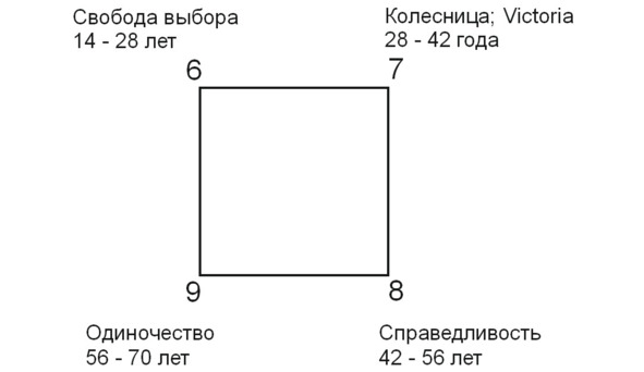Это круг, в который «внутреннее просвещенное дитя» толкает человека во плоти. Очевидно, что источником такого взгляда на периодизацию жизни является аналогия с делением года на четыре периода – сезоны. В греческой культуре «четверицу» вводит Пифагор, применяя ее ко многим явлениям жизни. Философ-математик и свою жизнь делил на четыре периода по 20 лет. Его последователи верили в его смерть в 80-летнем возрасте, хотя в действительности Пифагор прожил 84 года. Отражение представления о делении круга жизни на 4 части мы находим и в кельтском кресте. По представлениям кельтов жизнь делилась на 14-летние периоды. При этом шестой карте соответствует период с 14 лет до 28 лет.17