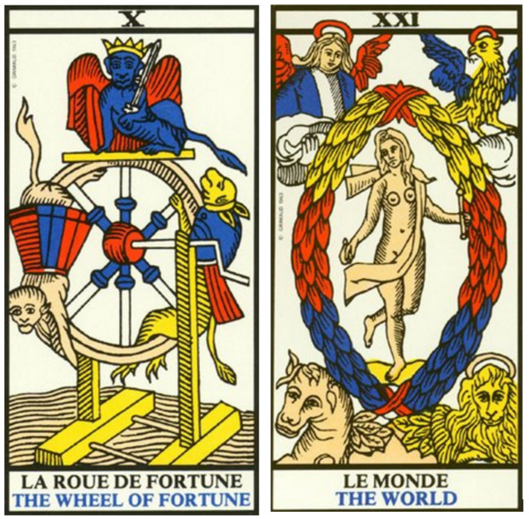 Отметим, что «Колесо фортуны» (карта 10) связано с нулевой картой, соответствующий Аркан для которой пока не определен, принципом симметрии. На 10 карте обычно изображается вращающееся колесо. Круг изображен также на 21 карте (Мир), которая, на первый взгляд, пока более всего подходит на роль нулевой карты. Тем более, что она иногда имеет именно нулевой номер.