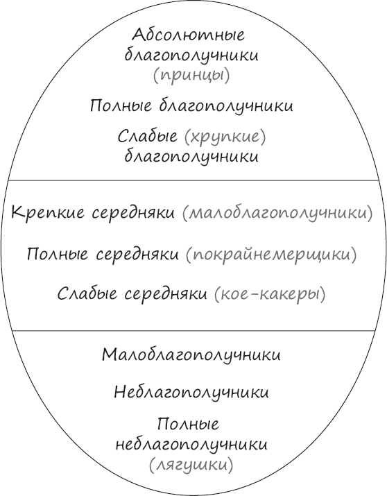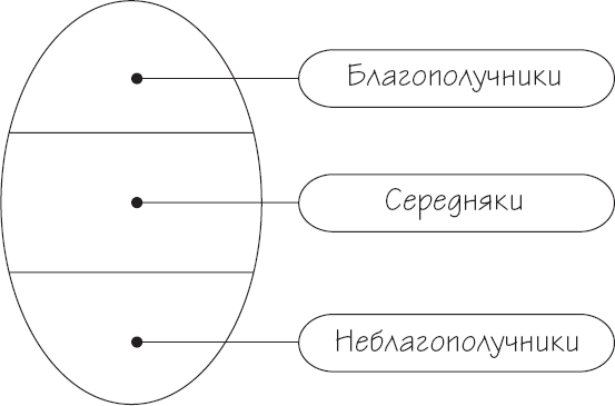 Во-вторых, благополучие человека презентировалось (и презентируется) в восточной версии нейропрограммирования как бы уровнево. Где я, следуя идеям еще трансактного анализа Э. Берна, поделил всех людей на благополучников (победителей), середняков (не проигрывающих и не выигрывающих, а иногда даже как бы и не участвующих в игре) и неблагополучников (проигрывающих) – иными словами, хакеров, юзеров и лузеров в компьютерной игре под названием Жизнь (рис. 1).