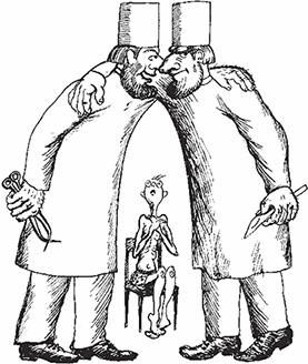 Врач (задумчиво и многозначительно): «Во многом это зависит от вас. Должен, однако, сказать, что консервативное или паллиативное лечение геморроя – это лишь отсрочка. Радикальная операция – вот единственно надежный метод лечения».