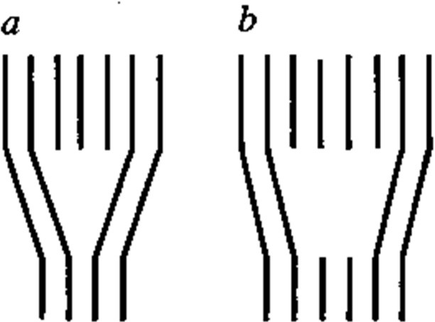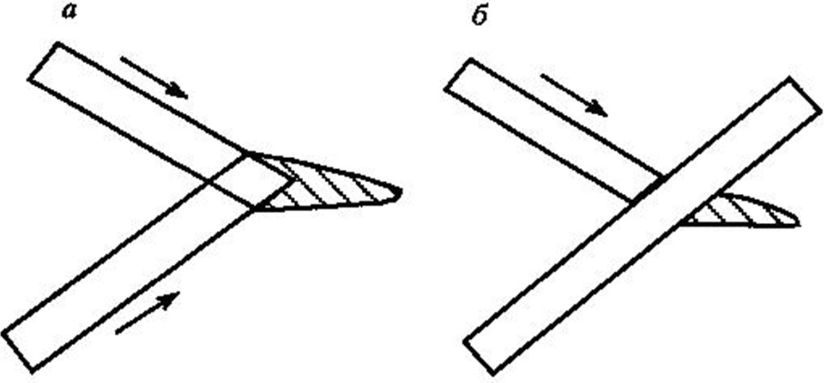 Рис. 6. Схема возникновения трещины при встрече развивающихся двойников (а) и торможения одного двойника другим (б) [3]