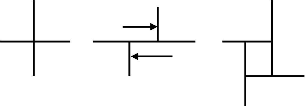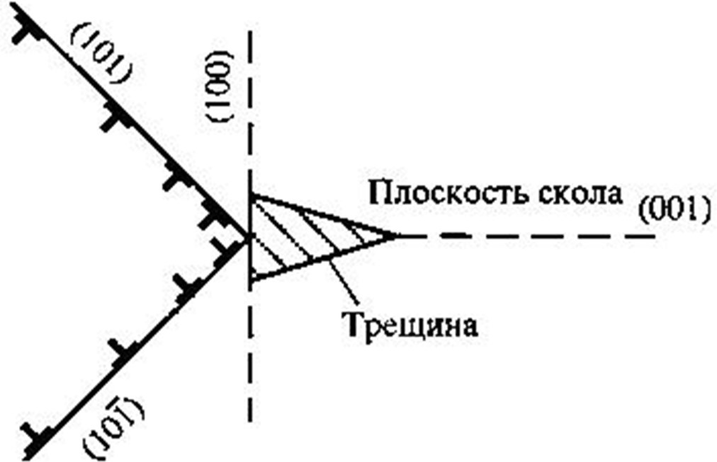 На рис. 4 показана схема образования трещины по этой модели. В растягиваемом образце происходит перемещение скользящей дислокации по пересекающимся плоскостям (101) и (101) (это плоскости наиболее плотной упаковки в ОЦК кристалле, и именно они являются плоскостями легкого скольжения). При встрече этих дислокаций возникает новая дислокация, расположенная в плоскости (100), не являющейся плоскостью скольжения. Дислокация встречи блокирует обе плоскости скольжения, что приводит к скоплению дислокаций и образованию зародышевой трещины в плоскости скола (001).