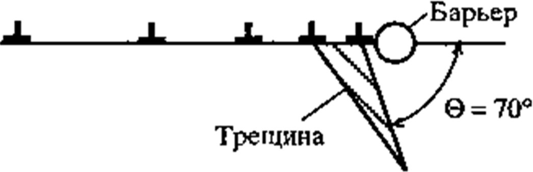 Модель заторможенного сдвига. Эта модель, подобно предыдущей, предполагает блокировку дислокаций барьером. Отличие ее заключается в том, что в голове дислокационного скопления возникают не только касательные напряжения интенсивностью nτ, но и значительные нормальные растягивающие напряжения в области под плоскостью скольжения. Эти растягивающие напряжения максимальны на плоскости, составляющей угол 70° с плоскостью скольжения (рис. 3).