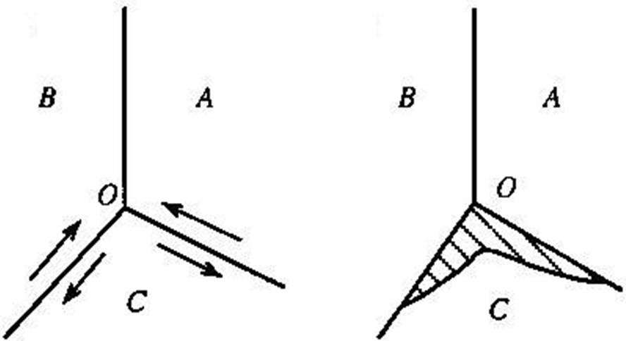 Рис. 7. Схема зарождения трещины в стыке трех зерен за счет межзеренной деформации [3]