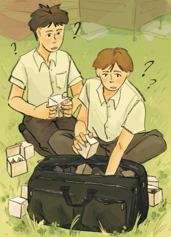 Идём с ним, по сторонам озираемся. И тут Влад вспомнил про овощной магазин. И правда, подходящее место. Добежали мы до него и зашли со стороны глухой стены. Там фруктовые ящики складывают, а от улицы стену кусты высокие закрывают. Рюкзаки сбросили, посидели. Вроде тихо, никого рядом нет. Стали осторожно молнии расстёгивать и коробочки по одной доставать.