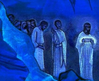 Н. К. Рерих. «Сжигание тьмы» (фрагмент). 1924. Слева на заднем плане изображены три образа, в которых можно узнать Ю. Н. Рериха, Н. К. Рериха и Е. И. Рерих (справа налево).