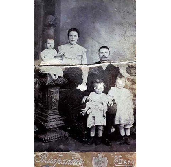 Самая первая фотография из семейного архива относится к этим счастливым годам. У семьи есть деньги на фотоателье, на фото Анна и Дормидонт скромно, но добротно одеты, на дочках светлые платьица с бантами и оборками. Судя по возрасту младшей Тоси, которую придерживает на декоративной консоли Анна Матвеевна, фотографию надо датировать 1905г. Семейный фотопортрет сделан в Баку на улице Торговой в ателье господина Бабаяна «Рембрантъ».