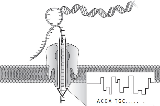 Еще одно достижение в области секвенирования нового поколения относится к 1970-м гг., когда Стив Хладки и Денис Хейдон из Кембриджа зафиксировали поток тока через одиночный ионный канал в искусственной мембране. Поскольку ДНК является заряженной молекулой, она также может пройти через этот открытый канал и при прохождении вызывает колебания тока, соответствующие генетической последовательности. Последующее развитие коммерческого «нанопорового секвенирования» компанией Oxford Nanopore Technologies (в частности, ее основателем Хэганом Бэйли) можно проследить до исследований 1980-х гг., когда впервые было обнаружено движение ДНК через поровые белки[46].